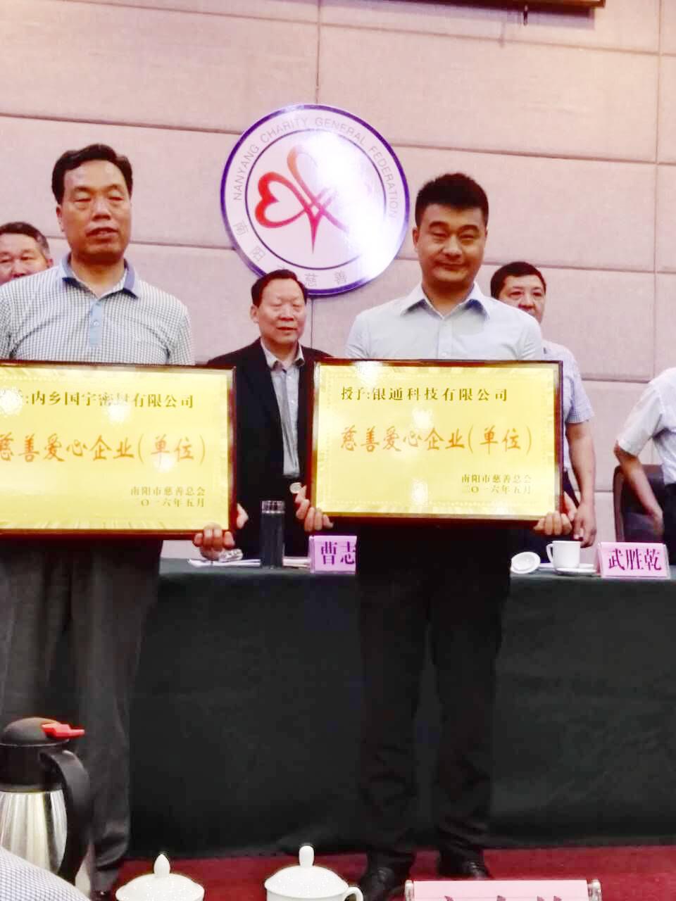 南陽銀通近年來連續(xù)獲得南陽市慈善總會愛心企業(yè),董事長王寶玉先生連年榮獲先進個人榮譽稱號并擔任慈善總會理事會副會長職務(wù)。南陽銀通自成立以來始終以“誠信、高效”為理念,以“質(zhì)量為本,服務(wù)至上”為宗旨,“慈善和愛心”為義務(wù),努力創(chuàng)造優(yōu)質(zhì)產(chǎn)品,打造良心企業(yè)。