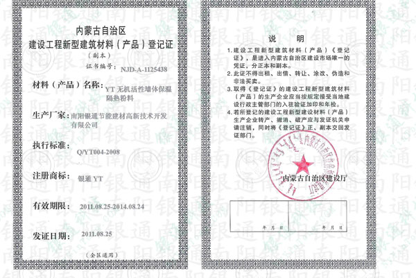 南陽銀通內蒙古自治區建設工程新型建筑材料(產品)登記證