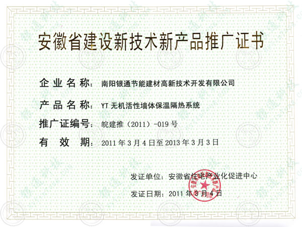 南陽銀通安徽省建設新技術新產品推廣證書 企業(yè)名稱:YT無機活性墻體保溫隔熱系統(tǒng) 推廣證編號:皖建推(2011)-019號 有效期:2011年3月4日至2013年3月3日 發(fā)證單位:安徽省住宅產業(yè)化促進中心 發(fā)證日期:2011年3月4日