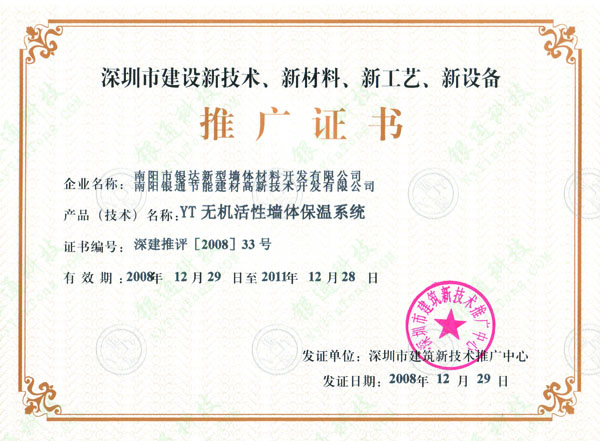 發(fā)證單位:深圳市建筑新技術(shù)推廣中心