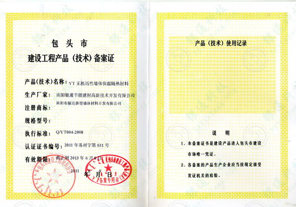 包頭市建設(shè)工程產(chǎn)品(技術(shù))備案證 產(chǎn)品(技術(shù))名稱:YT無機(jī)活性墻體保溫隔熱材料 生產(chǎn)廠家:南陽銀通節(jié)能建材高新技術(shù)開發(fā)有限公司 南陽市銀達(dá)新型墻體材料開發(fā)有限公司 執(zhí)行標(biāo)準(zhǔn):Q/YT004-2008 認(rèn)證證書編號(hào):2011年備材字第031號(hào) 有效期:截至到2013年6月8日 包頭市建設(shè)工程產(chǎn)品(技術(shù))備案專用章 2011年6月8日 產(chǎn)品(技術(shù))使用記錄 說明:1.本備案證書是建設(shè)產(chǎn)品進(jìn)入包頭市建設(shè)市場(chǎng)唯一憑證。 2.各備案的產(chǎn)品生產(chǎn)企業(yè)應(yīng)當(dāng)按規(guī)定接受發(fā)證機(jī)關(guān)的檢驗(yàn)。