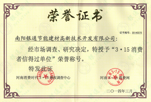 經市場調查、研究決定,特授予“3·15消費者信得過單位”榮譽稱號。