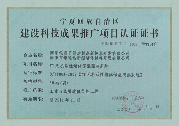 寧夏回族自治區 建設科技成果推廣項目認證證書 有效期至2011年11月