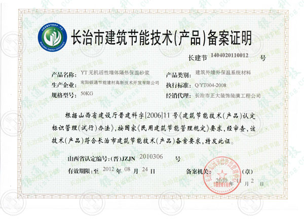 山西長治市建筑節(jié)能技術(shù)產(chǎn)品備案證明 長建節(jié) 1404020110012號 產(chǎn)品名稱yt無機(jī)活性墻體隔熱保溫砂漿 產(chǎn)品類型 建筑外墻外保溫系統(tǒng)材料 生產(chǎn)企業(yè) 南陽銀通節(jié)能建材高薪技術(shù)開發(fā)有限公司 執(zhí)行標(biāo)準(zhǔn) Q/YT2004-2008規(guī)格型號 50KG 根據(jù)山西省建設(shè)廳晉建科字【2006】11號建筑節(jié)能技術(shù)產(chǎn)品認(rèn)定標(biāo)識管理試行方法,按國家民用建筑節(jié)能管理規(guī)定要求,經(jīng)審查 該技術(shù)產(chǎn)品符合長治市建筑節(jié)能技術(shù)產(chǎn)品備案要求 特發(fā)此證 山西省認(rèn)定編號 晉JZJN2010306號 有效期限至2012年08月24日 備案機(jī)關(guān) 長治市建筑節(jié)能產(chǎn)品管理中心