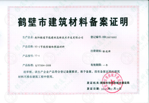 河南省鶴壁市建筑材料備案證明 備案編號HB20070002 企業名稱南陽銀通節能建材高新技術開發有限公司 產品名稱YT-1節能型墻體保溫材料 規格型號YT-A 注冊商標銀通牌 產品標準Q/YT004-2008 有效期限一年 經審核,該生產企業產品符合登記備案要求 準予備案沒有備案證明的建筑材料不準在建筑工程中使用 發證機關鶴壁市住房和城鄉建設廳 發證日期2010年12月31日