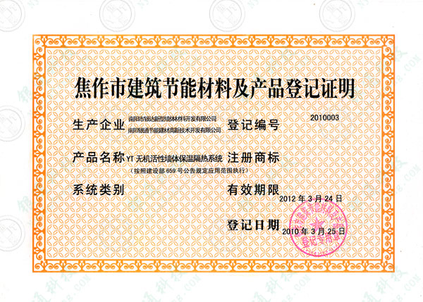 河南省焦作市建筑節能材料及產品登記證明 備案編號2010003 企業名稱南陽銀通節能建材高新技術開發有限公司 南陽市銀達新型墻體材料開發有限公司 產品名稱YT無機活性墻體保溫隔熱系統 規格型號YT-A 產品型號50kg/袋注冊商標銀通 銀達 產品標準Q/YT004-2008 有效期限2012年3月24日 登記日期 2010年3月25日 焦作市建筑節能材料及產品備案專用章