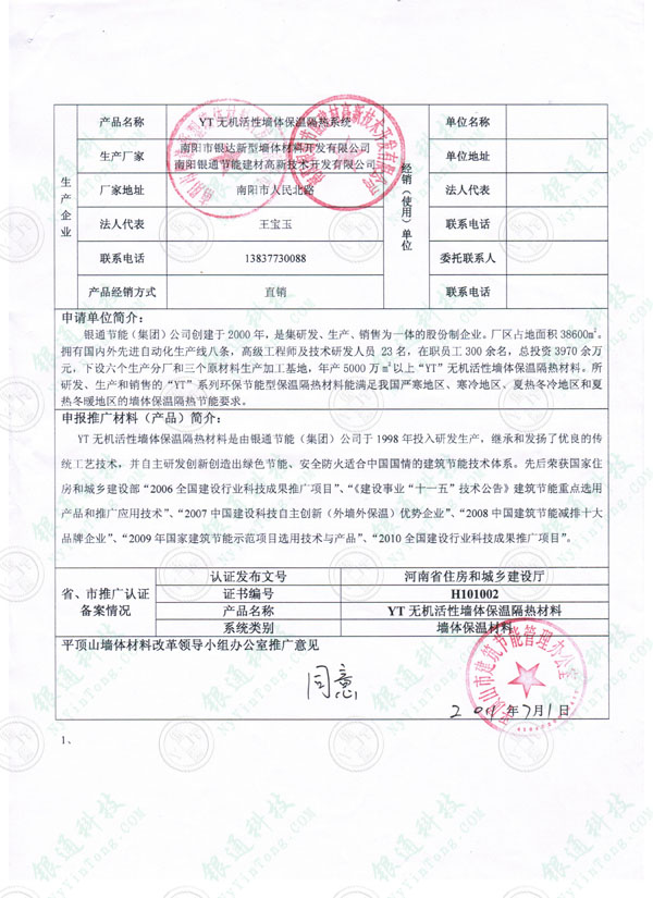 河南省平頂山市建筑節能材料備案登記證 企業名稱 南陽銀通節能建材高新技術開發有限公司 南陽市銀達新型墻體材料開發有限公司 產品名稱YT無機活性墻體保溫隔熱系統 系統類別墻體保溫材料 認證編號省建設廳推廣證書編號H101002 河南省住房和城鄉建設廳認證發布文號 規格型號YT-A 產品型號50kg/袋 注冊商標銀通 YT 平頂山市墻體材料改革領導小組辦公室推廣意見 同意備案 發證日期2011年7月1日