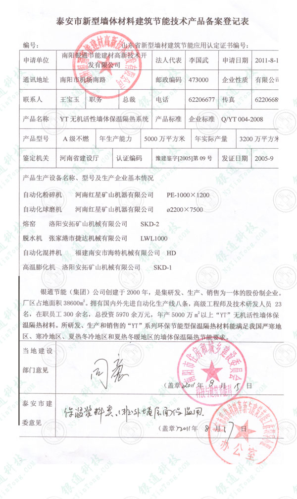 山東泰安市新型墻體材料建筑節(jié)能技術(shù)產(chǎn)品備案登記證 山東省新型墻材建筑節(jié)能應(yīng)用認(rèn)定證書(shū) 南陽(yáng)銀通節(jié)能建材高新技術(shù)開(kāi)發(fā)有限公司 你單位生產(chǎn)的yt無(wú)機(jī)活性墻體保溫隔熱系統(tǒng) 已經(jīng)取得山東省新型墻材建筑節(jié)能技術(shù)產(chǎn)品認(rèn)定證書(shū) 同意在我市建設(shè)工程保溫漿料中應(yīng)用 當(dāng)?shù)亟ㄔO(shè)部門(mén)意見(jiàn) 南陽(yáng)市住房和城鄉(xiāng)建設(shè)委員會(huì)科技與建筑節(jié)能科 同意推廣應(yīng)用 泰安市建委意見(jiàn) 保溫漿料類 外墻屋面保溫用 泰安市墻體材料革新與建筑節(jié)能工作領(lǐng)導(dǎo)小組辦公室 2011年8月17日