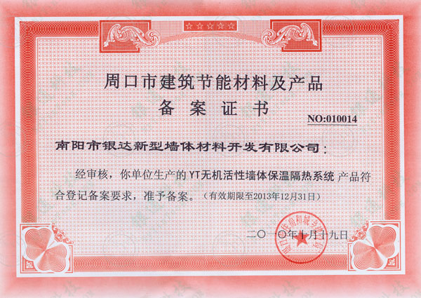 河南省周口市建筑節(jié)能材料及產(chǎn)品備案證書 證書編號NO010014 南陽銀通節(jié)能建材高新技術(shù)開發(fā)有限公司南陽市銀達(dá)新型墻體材料開發(fā)有限公司 經(jīng)審核 你單位生產(chǎn)的YT無機(jī)活性墻體保溫隔熱系統(tǒng)產(chǎn)品符合登記備案要求 準(zhǔn)予備案 有效期限至2013年12月31日 發(fā)證機(jī)關(guān) 周口市住房和城鄉(xiāng)建設(shè)局 發(fā)證日期2010年10月19日