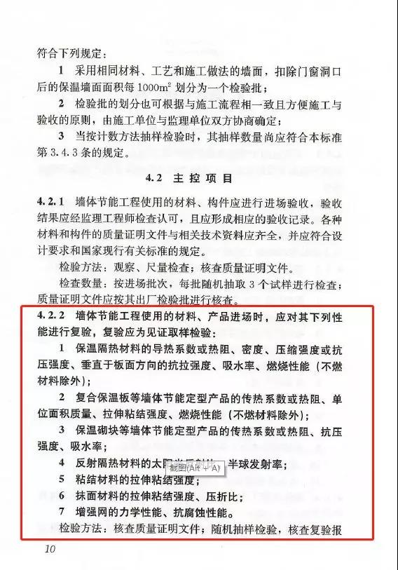 7.2.2:屋面節能工程使用的材料進場時,應對其下列性能進行復驗,復驗應為見證取樣檢驗:1.保溫隔熱材料的導熱系數或熱阻、密度、壓縮強度或抗壓強度、吸水率、燃燒性能(不燃材料除外);2.反射隔熱材料的太陽光反射比、半球發射率。