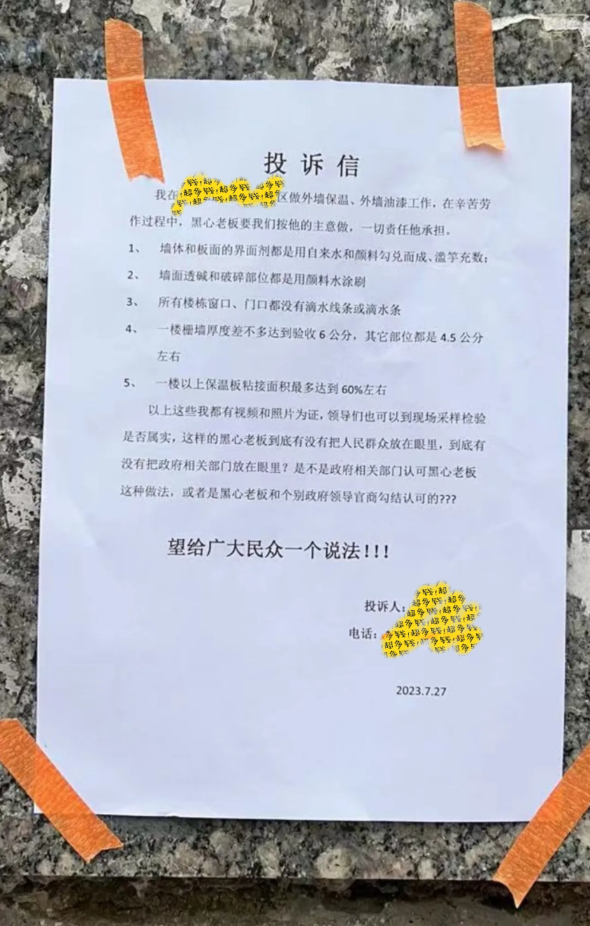 具體怎么干?來放一張前不久網上流傳的,一名外墻保溫工人的自曝投訴信,大家可以舉一反三:
