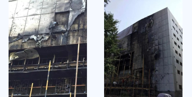 比如2018年2月1日鄭州綠地原盛國(guó)際辦公樓分別發(fā)生鋁塑板幕墻著火,3號(hào)樓的南側(cè)半面、整個(gè)東側(cè)被燒的一塌糊涂,北側(cè)也有部分過火。火舌所到之處,30mm厚的擠塑板與鋁塑板一同化為烏有。