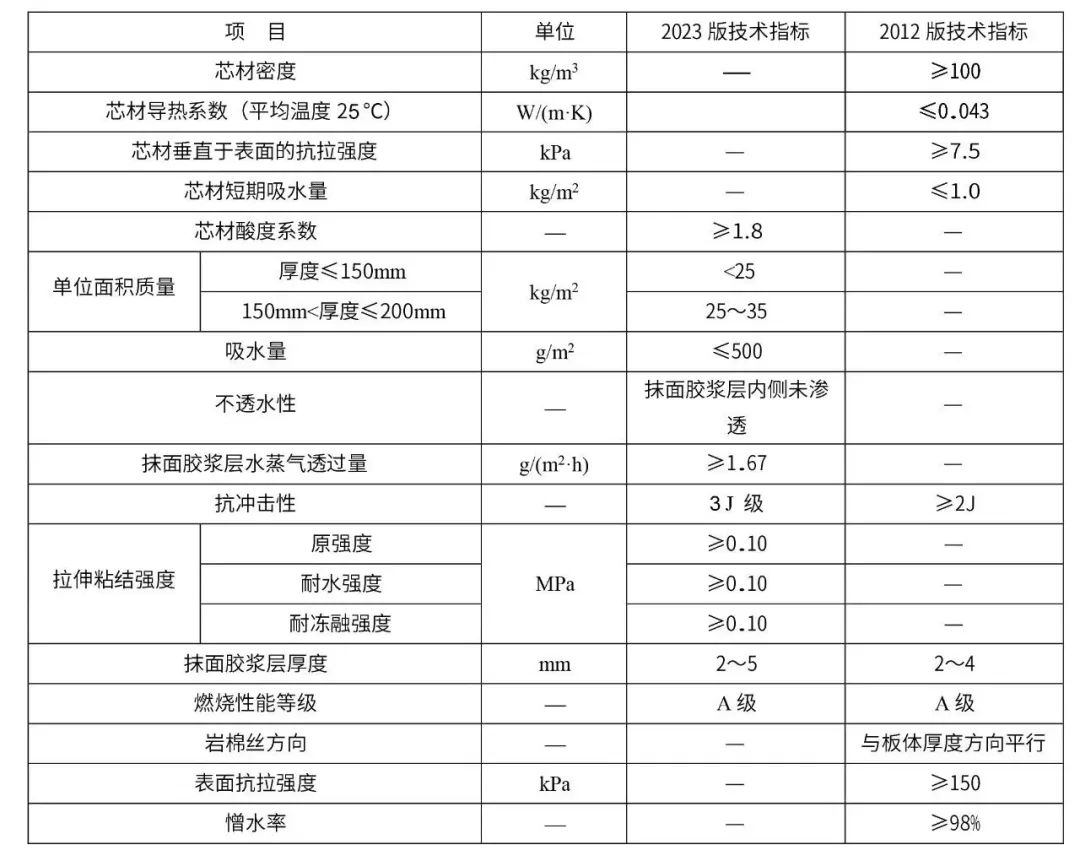 2023 版中增加了粘貼增強豎絲巖棉復合板用膠粘劑,性能見下表: