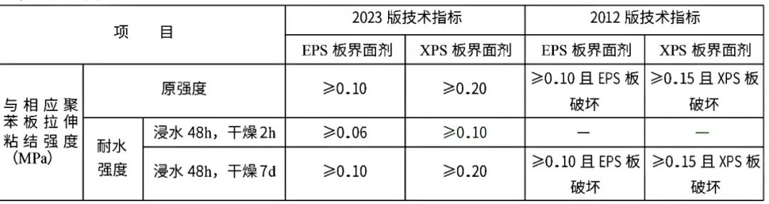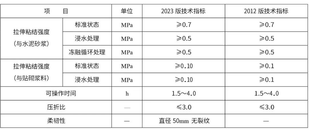 2023 版中取消了聚苯板膠粘劑、巖棉板膠粘劑,增加了粘貼硬泡聚氨酯板用膠粘劑、粘貼酚醛 泡沫板用膠粘劑,其性能指標分別符合現行行業標準《硬泡聚氨酯板薄抹灰外墻外保溫系統材料》 JG/T 420、《酚醛泡沫板薄抹灰外墻外保溫系統材料》JG/T 515 的規定。