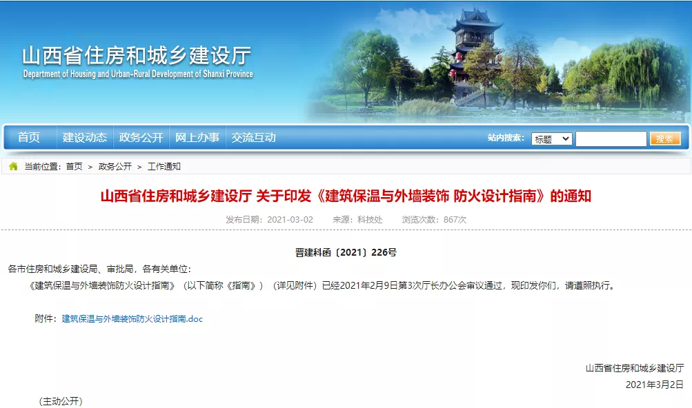 為預(yù)防建筑保溫與外墻裝飾引發(fā)火災(zāi)、保護(hù)人身和財(cái)產(chǎn)安全,山西省住房和城鄉(xiāng)建設(shè)廳近日印發(fā)《建筑保溫與外墻裝飾防火設(shè)計(jì)指南》。指南自4月1日起施行。