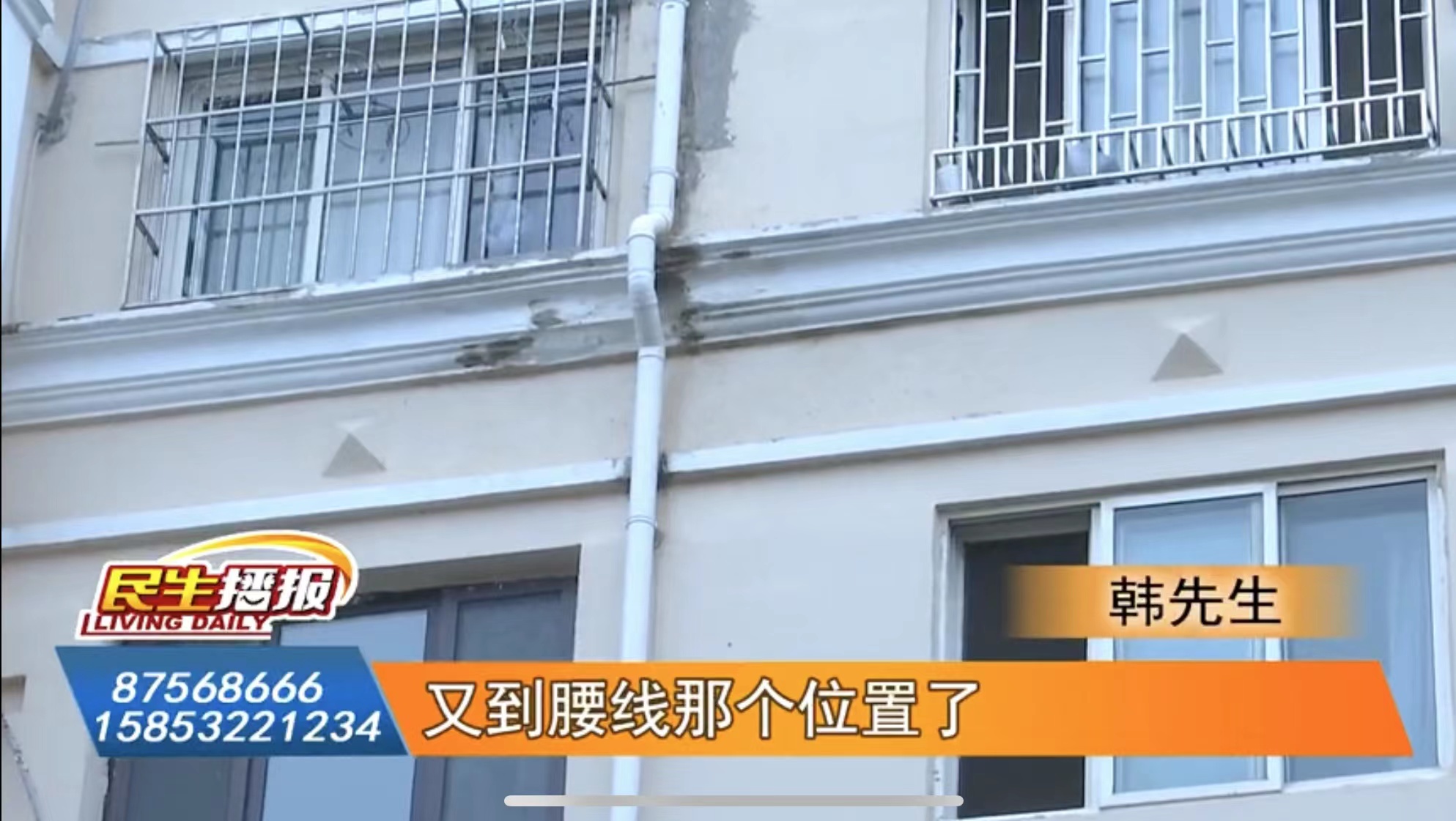 韓先生說外墻做保溫后會有夾層,裝飾腰線里積水后,水就會順著夾層滲入到屋里,從而導致家里漏水、墻皮長毛。他建議把腰線拆掉,但是拆腰線工程比較大,外墻保溫施工單位不會拆,物業(yè)也不會允許隨便拆除外墻裝飾腰線。