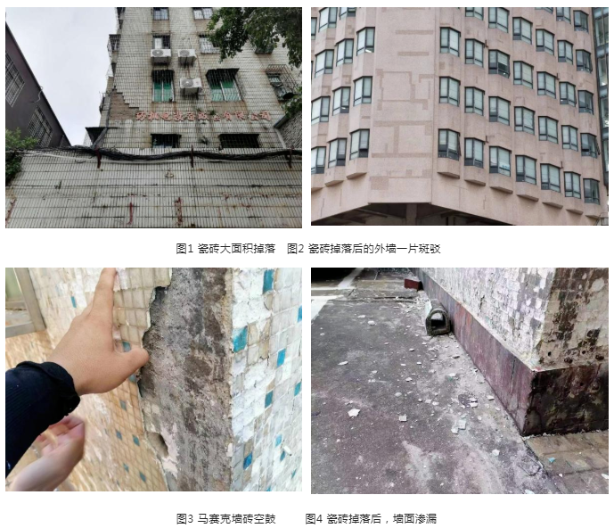 瓷磚脫落一方面有礙觀瞻,就像墻面得了 “牛皮癬”一樣,看上去特別不舒服;另外,瓷磚脫落容易砸傷行人和車輛,危及樓下行人的生命安全,給社會公共安全造成較大危害。此外,瓷磚脫落,時間長了會引發(fā)墻體開裂,造成室內墻體滲漏,墻面裝飾涂料或者墻紙發(fā)生起皮、脫落和霉變現象,給居民生活帶來諸多不便,而且維修起來費時費力費錢,成為不少居民的“心頭病”。圖1—4為海口市老小區(qū)外墻瓷磚空鼓、脫落情況。