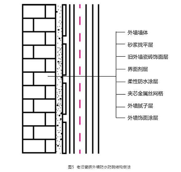 針對老舊小區(qū)外墻脫落問題,筆者公司研發(fā)了一種老舊瓷磚外墻防水防脫施工工藝,該工藝已經在海南省舊改外墻項目大量應用,均取得較好的施工效果,也申請了國家知識產權局的“實用新型專利”。該老舊瓷磚外墻防水防脫結構做法見圖5。