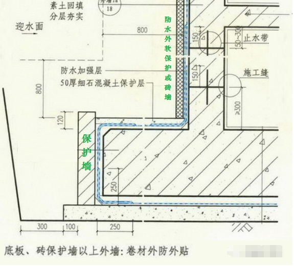 ↘↘基礎外挑部分側邊砌筑保護墻,卷材防水采用外防內貼法;基礎以上砌體采用外防外貼法,如下圖所示。