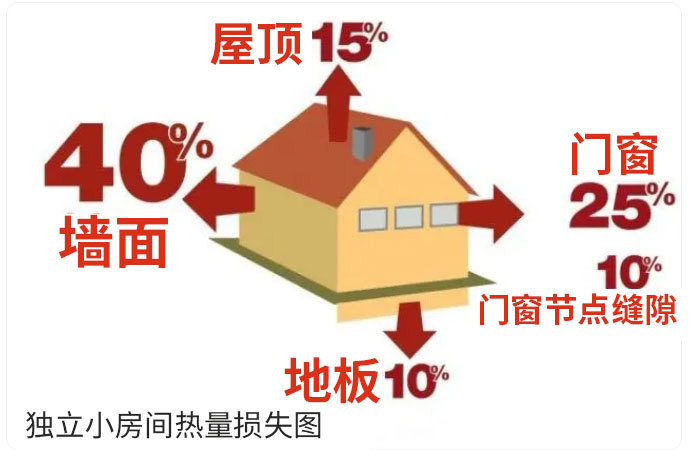 從圖中看出一間房子主要熱量損失都是從墻體損失的,以前農(nóng)村的房子用土坯砌筑,厚度很大,能很好的起到保溫隔熱的作用,而現(xiàn)在的房子大部分都是24墻很少的一部分有37墻,基本上就沒(méi)有50墻了,墻的厚度達(dá)不到那又如何談保溫隔熱呢?